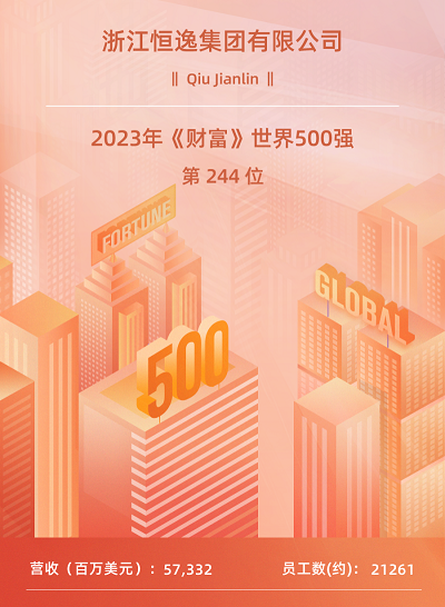 8月2日,2023年《財富》世界500強排行榜單發布。恒逸集團以2022年度57332百萬美元的營業收入,躍居第244位,排名較上年前移20位,連續三年榮列《財富》世界500強。此外,恒逸集團列2023年《財富》中國500強第72位,恒逸石化列2023年《財富》中國上市公司500強第89位,雙雙躋身前100強。